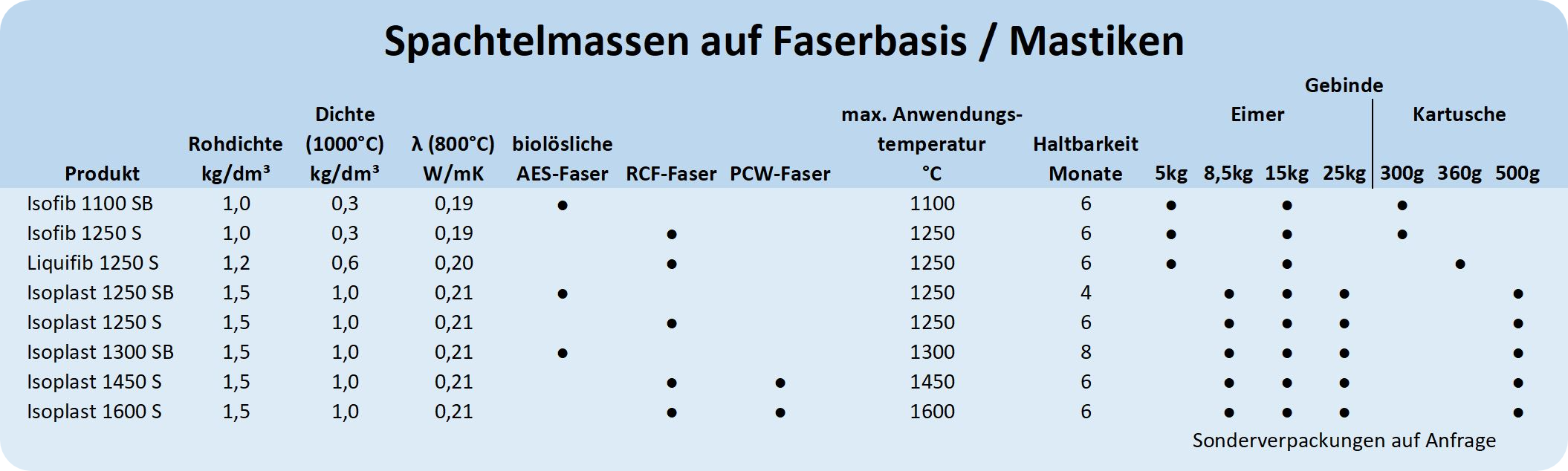 - Erhältlich auch mit biolöslichen AES-Fasern (Haltbarkeit garantiert 4 Monate, Isoplast 1250 SB oder NEU: 8 Monate, Isoplast 1300 SB)