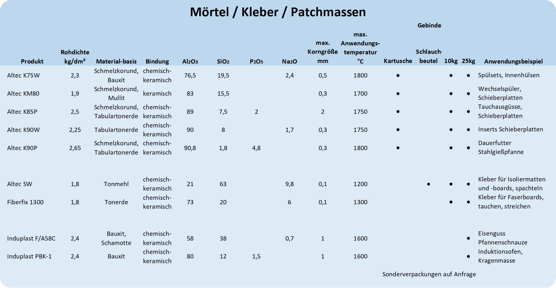 Dabei kommen Rohstoffe auf Alumina-, Silika-, Zirkon- und Schamottebasis sowie Leichtfüllstoffe und keramische oder biolösliche Fasern zum Einsatz. Die Bindesysteme reichen von keramisch über chemisch hin zu kombinierten Bindemitteln.